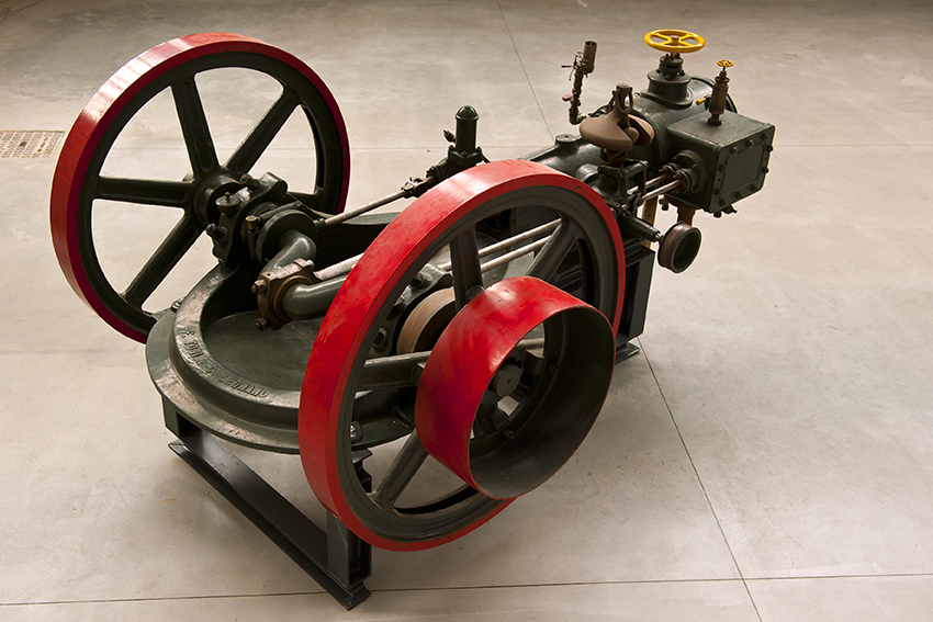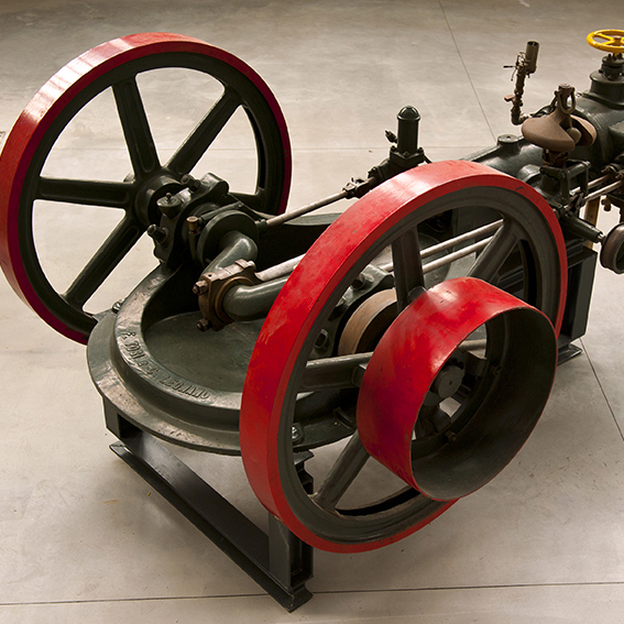 manovella. Una cinghia collega l'albero motore ad un volano doppio.