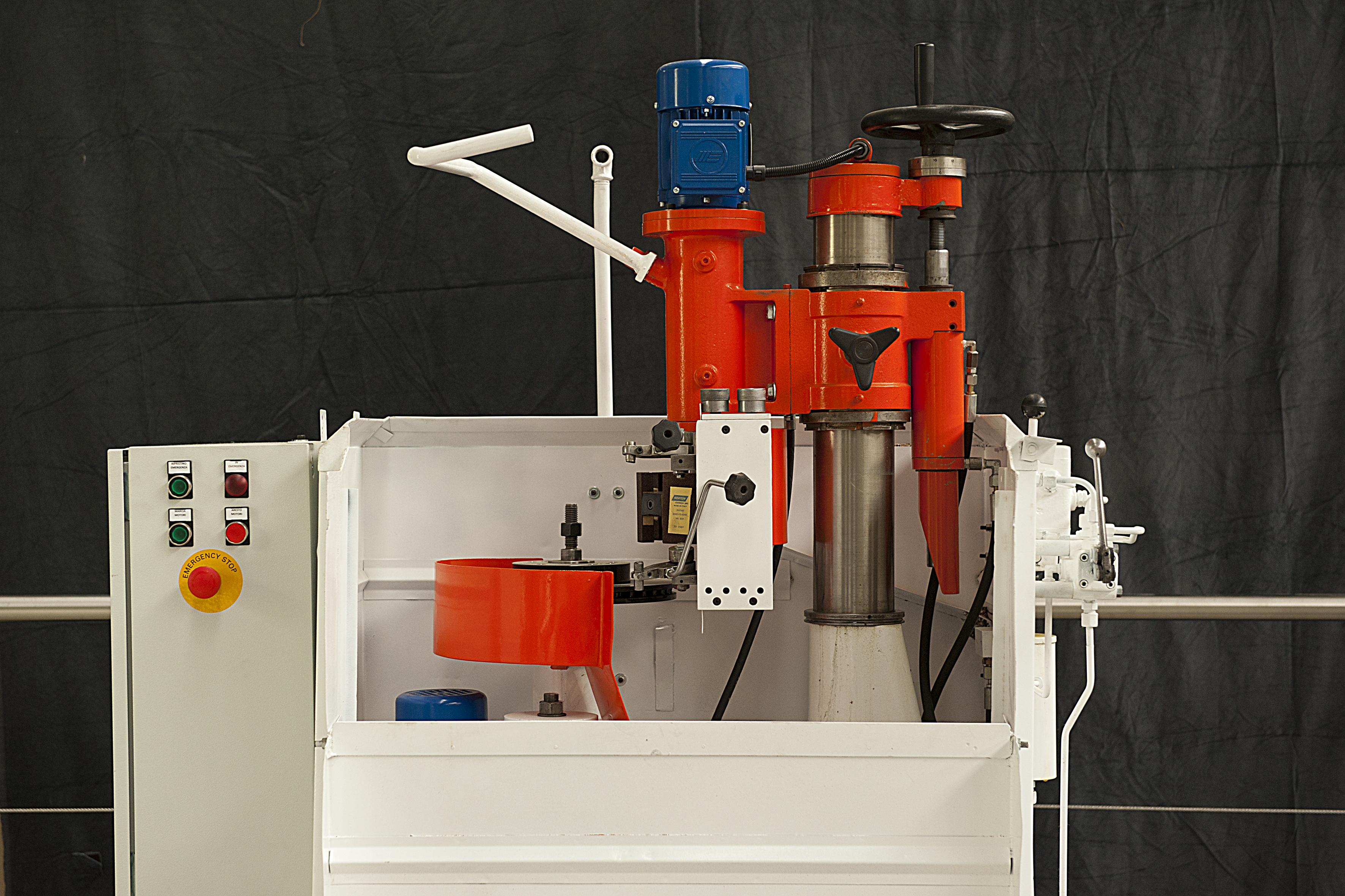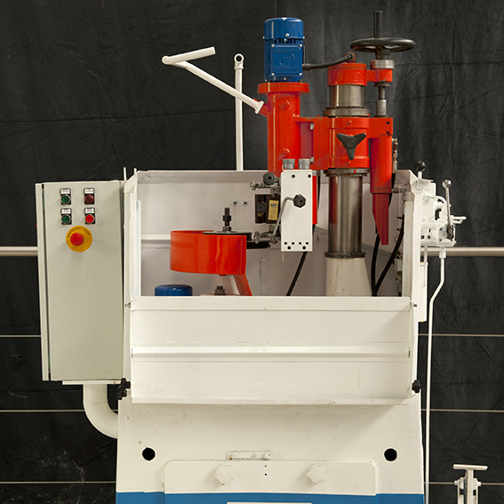 Anche il mandrino porta-mola è dotato di movimento di oscillazione; inoltre ha movimento di alimentazione ovverossia di avvicinamento della mola alla superficie del disco, con possibilità di spostamenti micrometrici a lettura centesimale su apposito tamburo abbinato al volantino di comando.